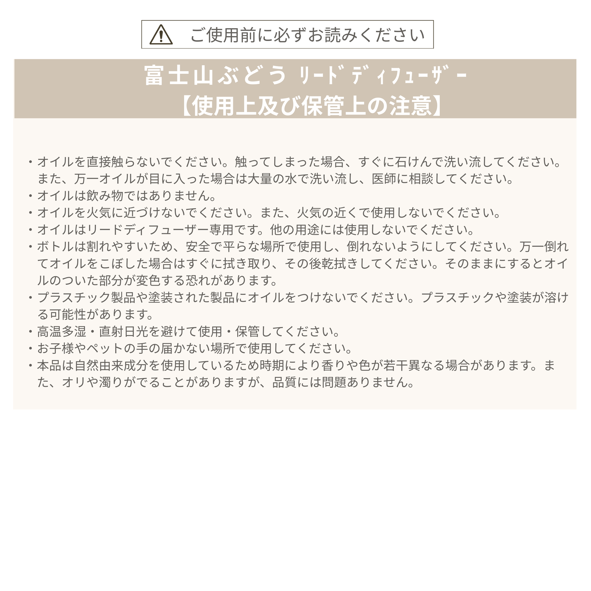 ※固くキャップを閉めております。オイルがこぼれないよう本体をしっかり押さえながらゆっくり開けてください。香りと消臭期間はスティックの本数やお部屋の環境により異なりますが、約2~2.5ヶ月持続します。また、香りが弱いと感じたときは、スティックを逆さに入れ替えてください。