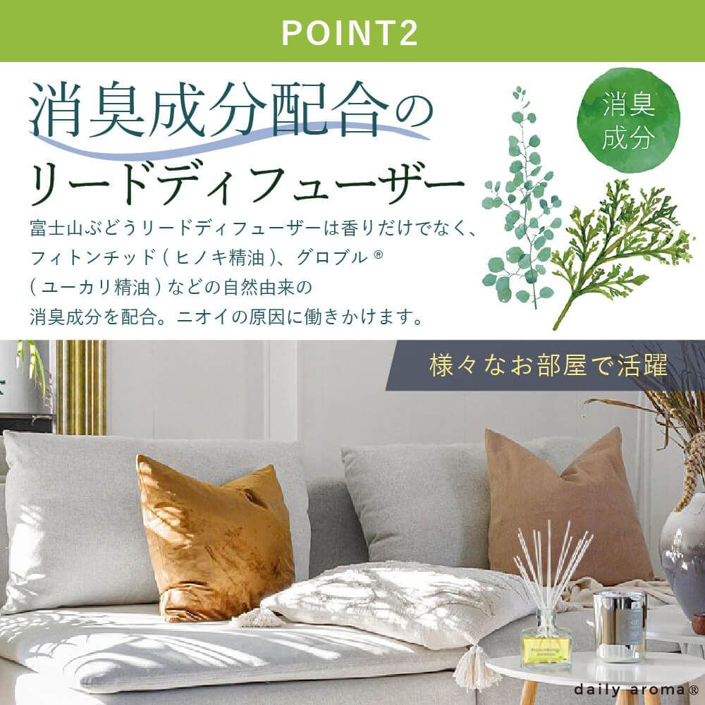 フィトンチッド(ヒノキ精油)、グロブル®(ユーカリ精油)などの植物由来消臭成分がニオイの原因に働きかけお部屋を快適な空間に。